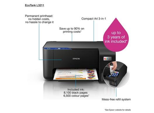 Epson EcoTank L3211 е мултифункционален принтер со висока ефикасност и ниски трошоци по страница, идеален за домови и канцеларии со честа потреба за печатење во боја. Овој модел користи иновативна EcoTank технологија со резервоари за мастило кои се полнат, што значи дека нема потреба од заменливи кертриџи. Со можност за печатење, копирање и скенирање, L3211 е компактен и лесен за користење.